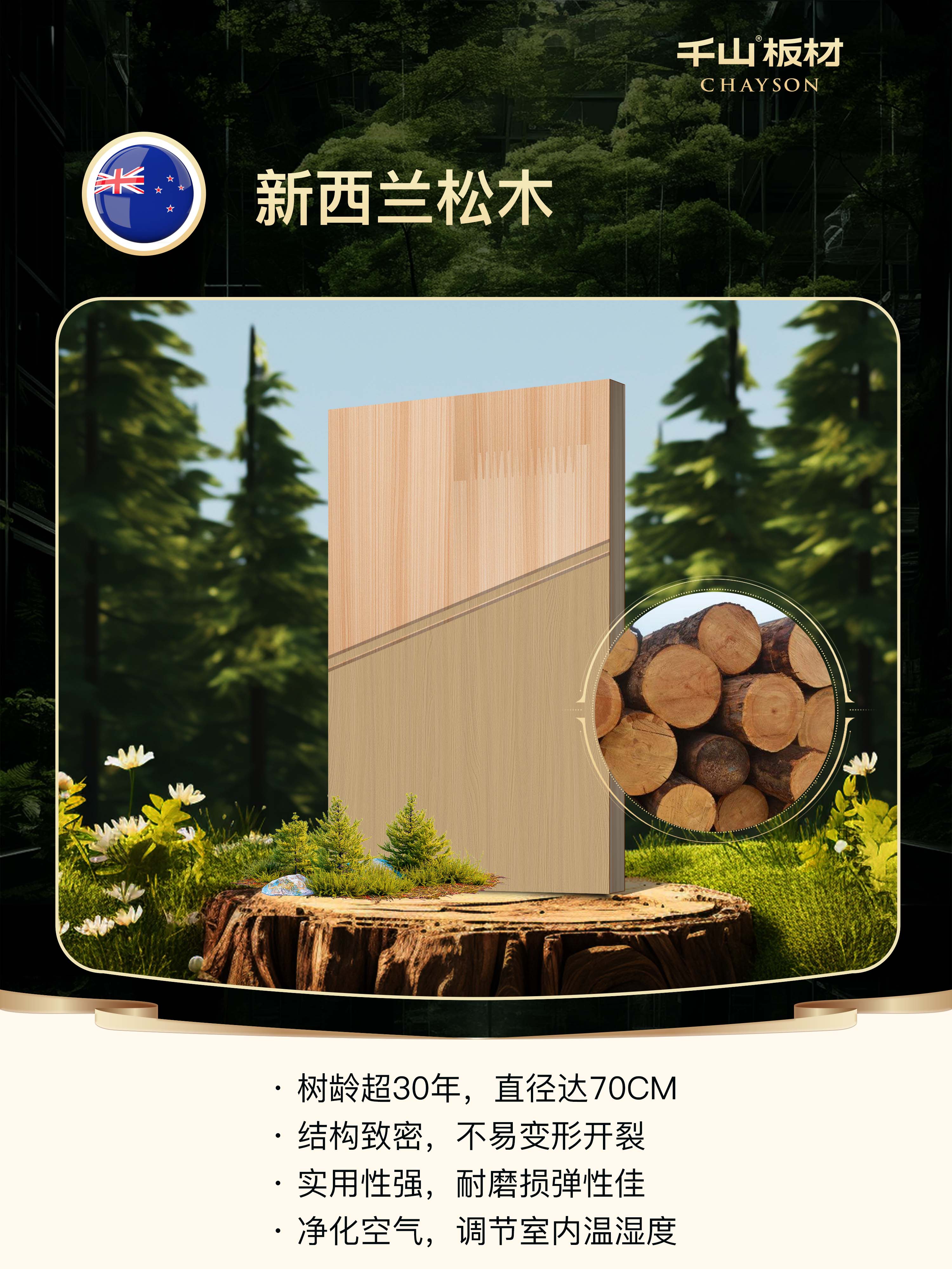 新西蘭松木樹齡超30年、直徑達(dá)70CM,結(jié)構(gòu)致密,不易變形開裂,耐磨損且彈性佳,實用性強(qiáng),穩(wěn)定性大幅提升。