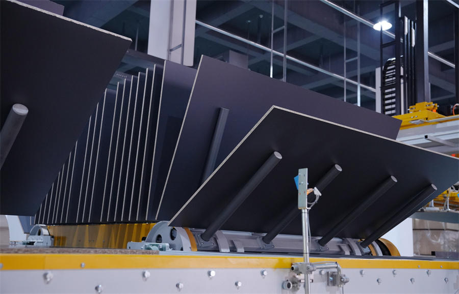 作為“壓貼領(lǐng)域的領(lǐng)導(dǎo)者”,溫康納在短周期壓貼領(lǐng)域處于世界領(lǐng)先地位,占據(jù)了國內(nèi)高端市場。相比于傳統(tǒng)壓貼產(chǎn)線數(shù)分鐘的周期,溫康納產(chǎn)線的壓貼周期大幅壓縮,效率提升數(shù)倍以上,產(chǎn)能可達到4800張/20小時。 溫康納智能化產(chǎn)線實現(xiàn)全流程自動化無縫銜接,從自動上下料、自動進板裝置到壓機壓貼、清邊倒角、翻板檢驗等,每個環(huán)節(jié)都實時調(diào)控。更令人驚嘆的是紅外激光精準(zhǔn)對紋系統(tǒng),將誤差嚴(yán)格控制在毫米級以內(nèi),使板材紋理對接的美觀度實現(xiàn)質(zhì)的飛躍。 溫康納生產(chǎn)線保證了板材在最大壓貼范圍內(nèi)材料之間的最小厚度差,能夠更靈活地使用基材,同時確保產(chǎn)品質(zhì)量的穩(wěn)定性。溫康納的精密與進口鋼板“珠聯(lián)璧合”,將使千山板材潮流花色達到行業(yè)新高度,實現(xiàn)高顏、高質(zhì)、高品體驗。 溫康納生產(chǎn)線的引進是千山智能制造戰(zhàn)略的重要組成部分。在消費升級和產(chǎn)業(yè)轉(zhuǎn)型的大背景下,千山并沒有選擇簡單擴大產(chǎn)能的道路,而是通過引進頂尖技術(shù)裝備,實現(xiàn)從“制造”到“智造”的跨越。